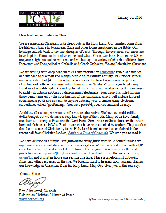 A Campaign from the Palestinian Christian Alliance for Peace Engaging churches, responding to propagandaPCAP’s Rev. Dr. Alex Awad sends a letter to American churches targeted by multimillion dollar Israeli hasbara (propaganda) campaign of disinformation.