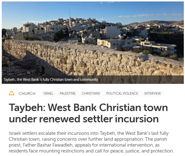 Violent settler attacks and raids, supported by Israeli military and police, are expanding, terrorizing villagers and destroying property. Vatican News covered this wave, capturing the suffering of the Palestinian Christian village of Taybeh, in an article here.